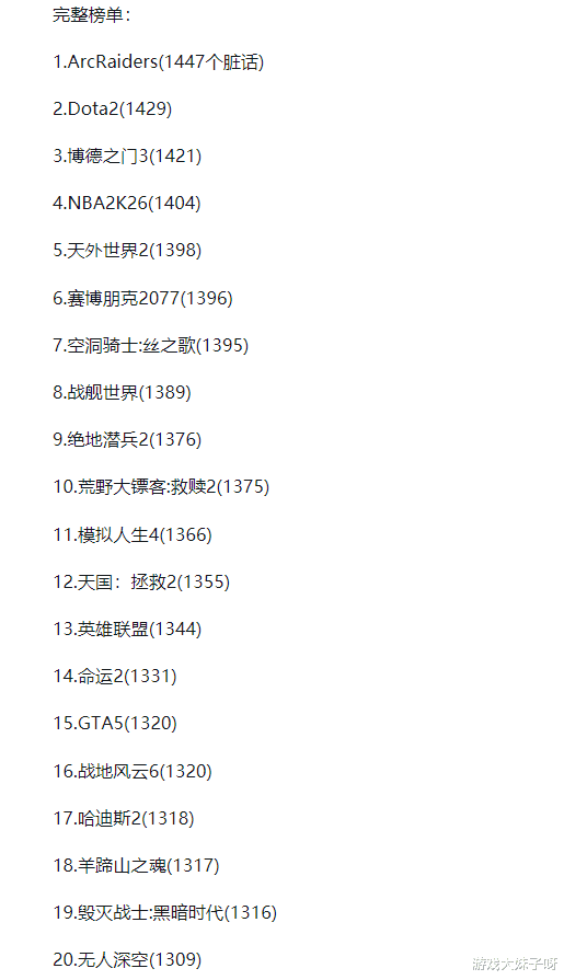 然而最让人意外的是,榜单第一不是“老牌战神”Dota2,也不是常年“情绪管理困难”的《英雄联盟》,更不是以玩家互喷著称的《GTA5》社区,而是——《ArcRaiders》,一个尚未全面正式上线的新游,居然以1447条脏话强势夺冠,可谓“出道即巅峰”。